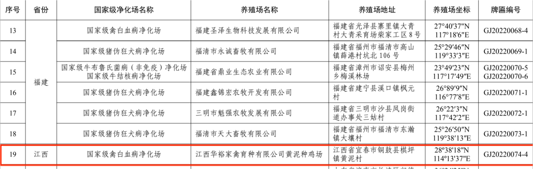 2022年11月7日,農業農村部辦公廳公布了第二批國家級動物疫病凈化場名單,江西華裕黃泥種雞場獲得“國家級禽白血病凈化場”稱號。