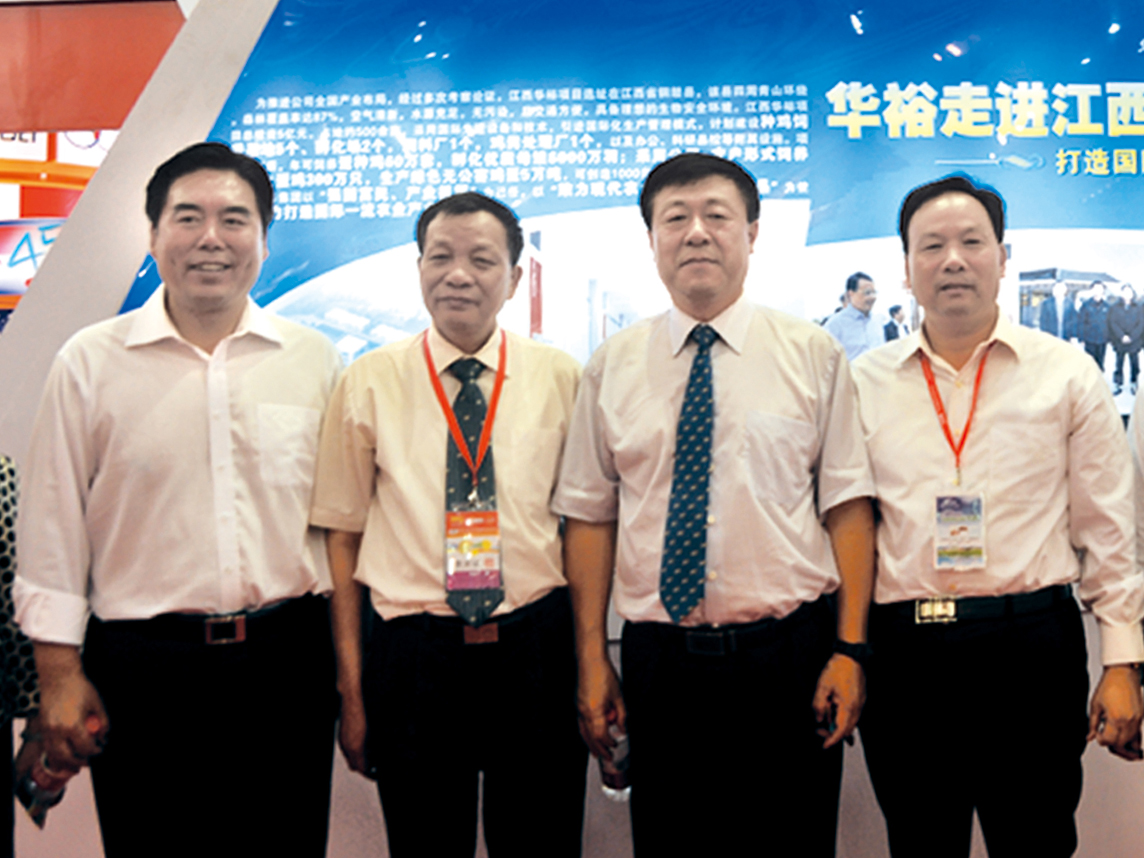 農業部副部長于康震(左三),中國畜牧業協會第四屆理事會會長、主席團主席李希榮(左一)農業部原總畜牧師王智才(左二)與董事長王連增在畜博會展位合影